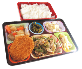 おかずは日替わりなので、お子さまでも飽きずにお楽しみいただけます。オフィスでのご利用や建設現場の職人さんなどの毎日のお弁当にもオススメです。ご飯大盛り無料や、インスタントお味噌汁のサービスもあり、多くのお客様にお喜びいただいております。